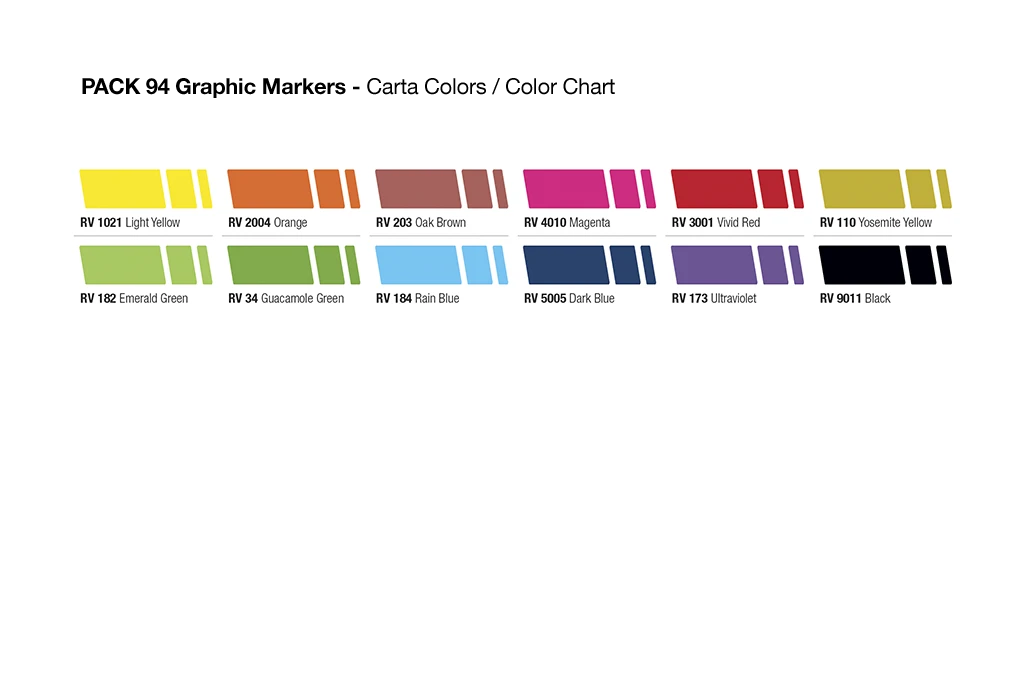 Pack of 12 dual tip felt markers with a fine tip for drawing and a chisel tip for filling in color or doing calligraphy. The colors are similar to a selection from the 94 spray paint color range and thanks to their translucent, alcohol-based ink, they may be combined in layers.
